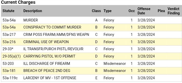 Laundry List of Criminal Charges against Dante Howell of Meriden in connection to the Waterbury Court House Murder of Jarron Chapman. Arraignment scheduled for 10am Wednesday Morning.