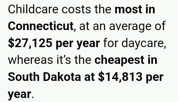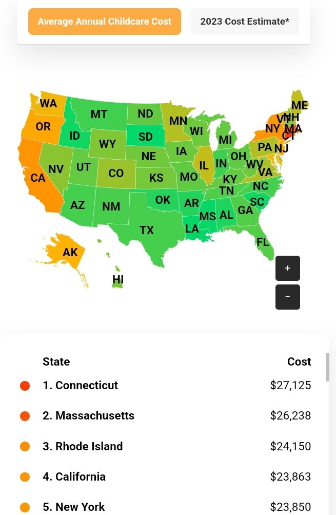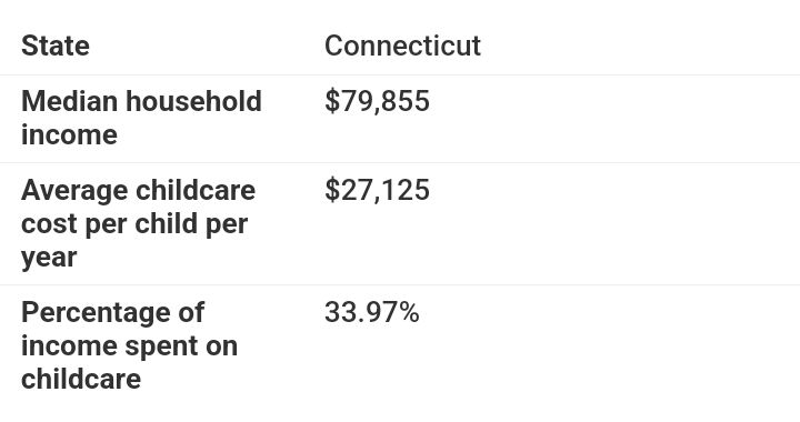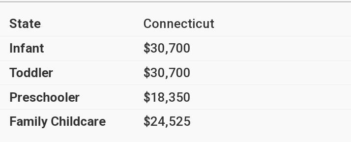 According to Americanprogress.org Connecticut is the 3rd most expensive state to raise a child and the most expensive for childcare overall. 1 more year for a four year old to attend a daycare could reach upwards of $14,000. See charts below for the staggering cost of daycare in Connecticut.