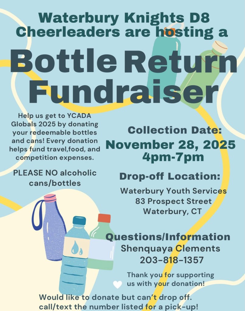 Waterbury, CT- The Waterbury Knights D8 Cheerleaders are kicking off a Bottle Return Fundraiser to help cover travel, food, and competition expenses for their upcoming trip to YCADA Globals 2025.