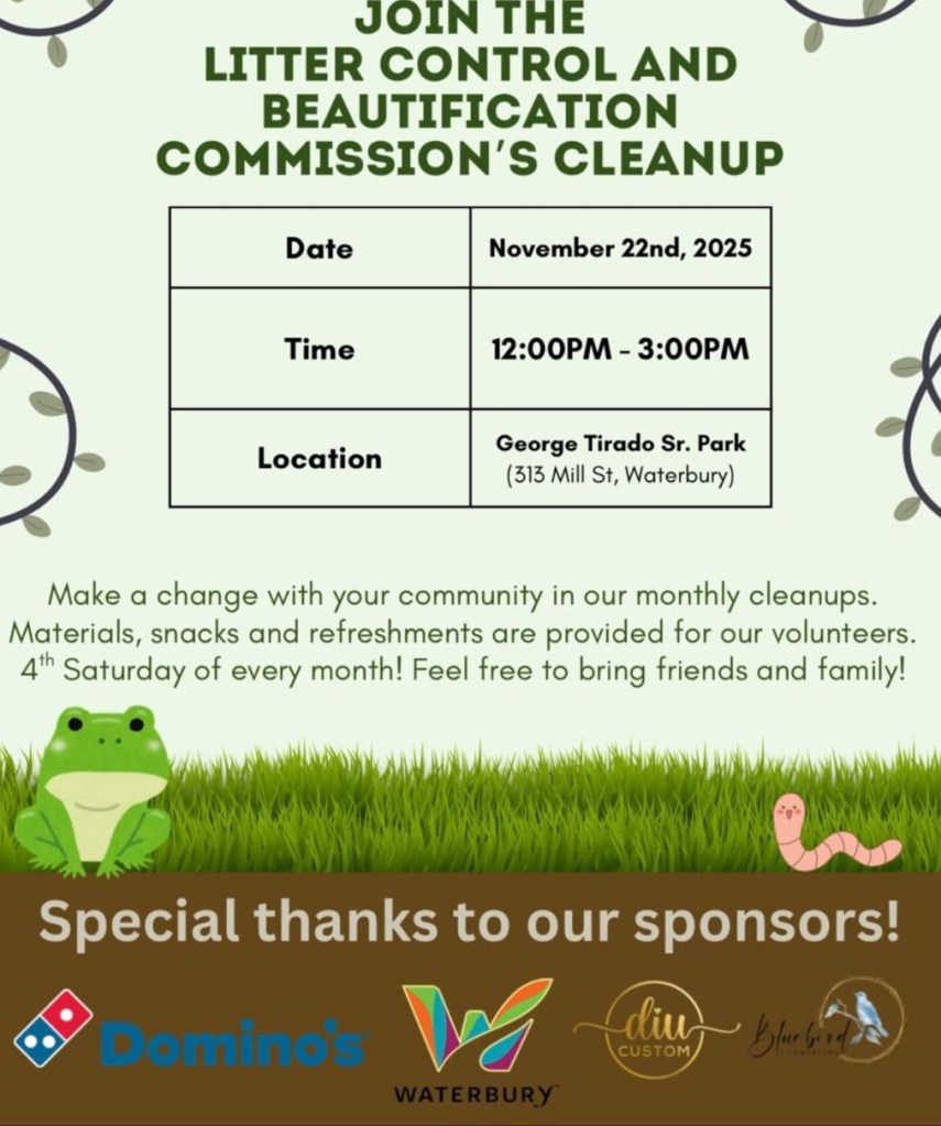 The cleanup takes place November 22, 2025, from 12:00 PM to 3:00 PM at 313 Mill Street, Tirado Park and volunteers of all ages are invited to help restore one of Waterbury’s important neighborhood spaces.