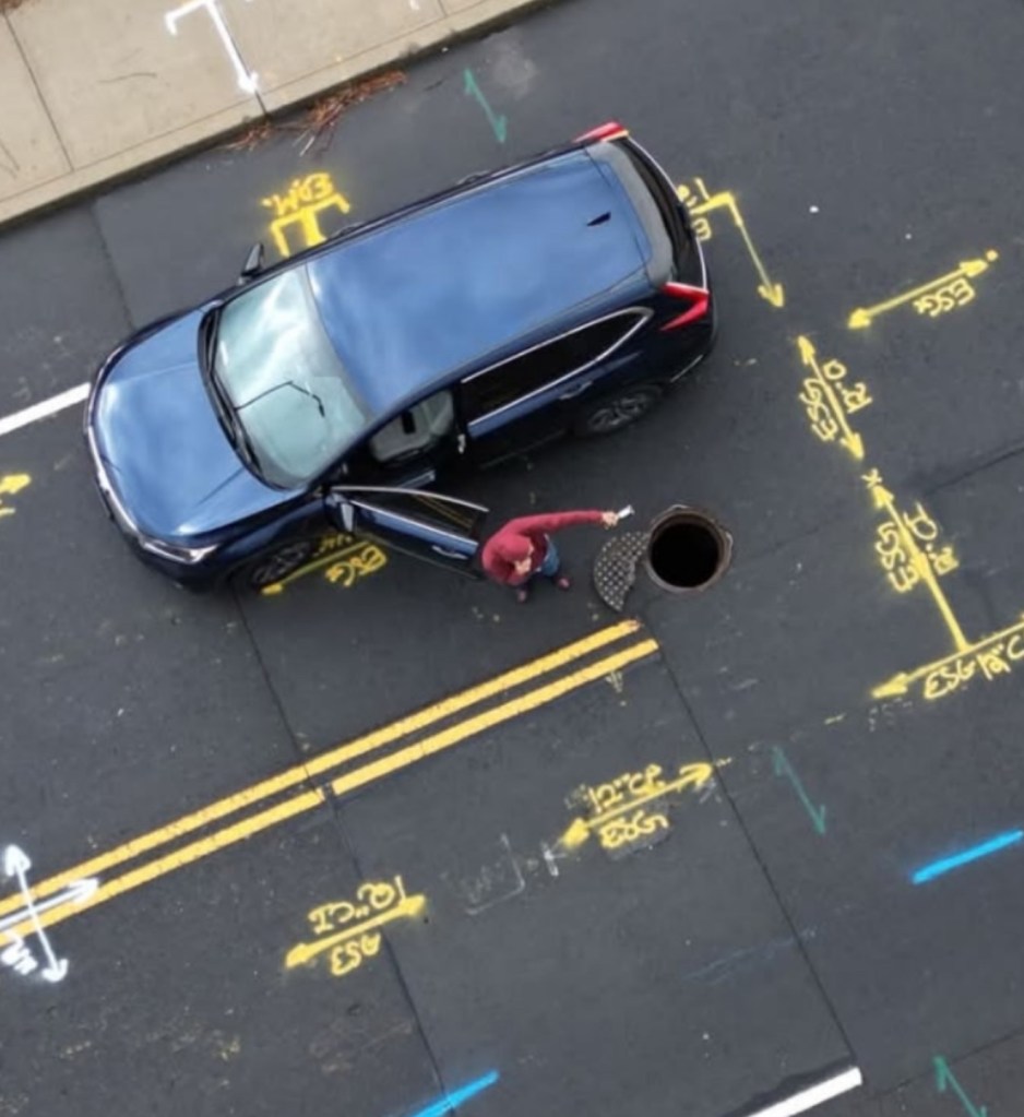 Aerial view of a broken manhole on Jackson Street, Waterbury, CT, with a driver stopping traffic to prevent accidents.”