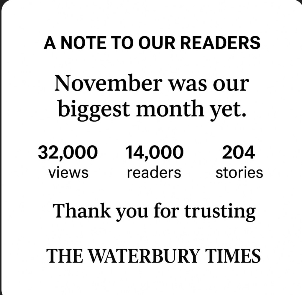 As we move into December, our commitment remains the same: to provide real-time updates, highlight local issues, and strengthen public-service journalism in Waterbury.