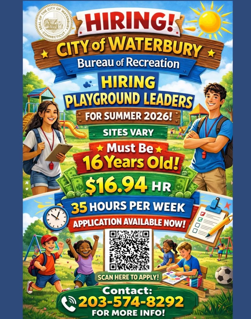 Waterbury-The City of Waterbury’s Bureau of Recreation is now accepting applications for Playground Leaders for the upcoming Summer 2026 season. This is an exciting opportunity for teens to gain valuable work experience, engage with the community, and earn competitive pay while enjoying the summer months.